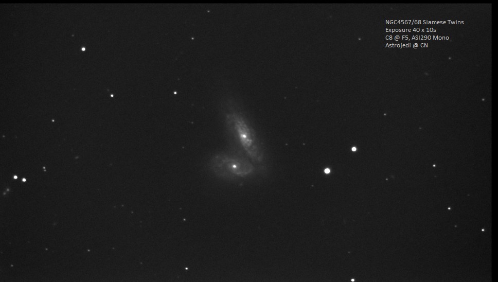 ARP242 The Mice Galaxies. These are relatively small and to tease out any detail with live stacking you need good seeing and transparency. This is a stack of 160x4s with the ASI290MM at full resolution i.e. x1 bin. The image has been cropped to focus on the object.