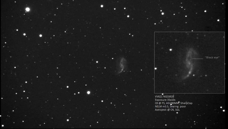 Unfortunately conditions were less than optimal to observe such small faint objects – with a 55% waxing Moon, red/white LP zone and not great seeing or transparency – all impacting SNR significantly…