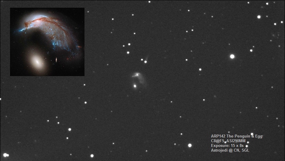 First up is The Penguin and Egg. The pair resides in Hydra and is about 300 Mly distant. This is the violent merger of NGC2936 (one that looks like the Penguin) and 2937 (the Egg). Galaxy interactions usually cause a burst of star formation in the members. If you look at the Hubble inset you can see large blue regions where new stars are being formed. Click on the image to view full size.