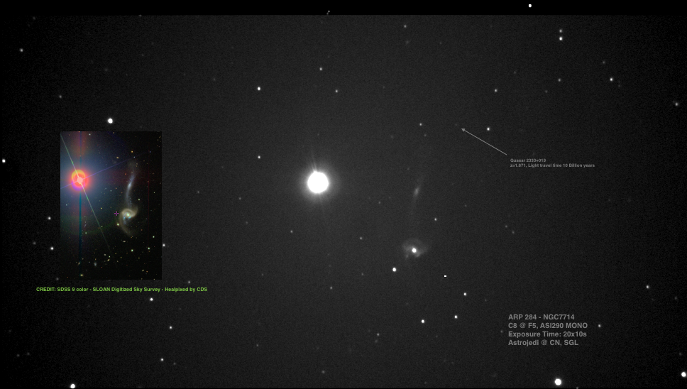 This is a tough one visually (like most ARPs). I can just detect it in my 14″ but cannot make out much detail. I have marked a quasar from which light has been traveling for about 10 billion years. Could not find definite mag information on it but looks to be between 17-18 V mag based on a quick photometric analysis (without proper calibration hence the error range).