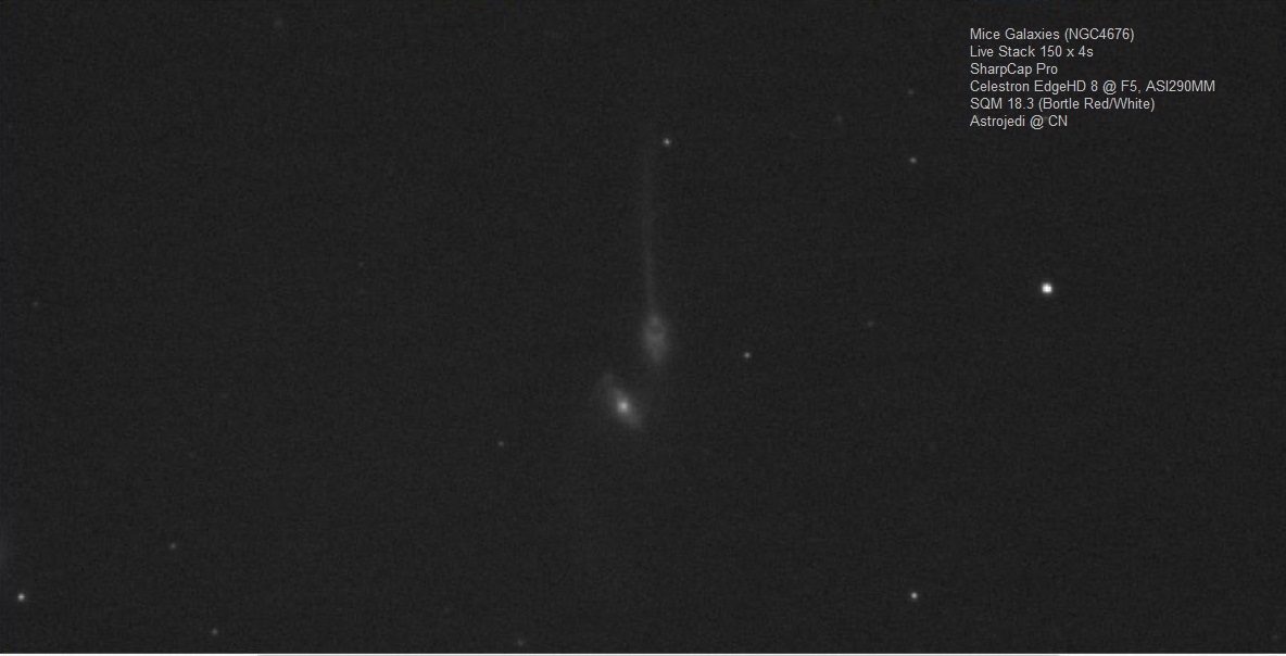 ARP242 The Mice Galaxies. These are relatively small and to tease out any detail with live stacking you need good seeing and transparency. This is a stack of 160x4s with the ASI290MM at full resolution i.e. x1 bin. The image has been cropped to focus on the object.